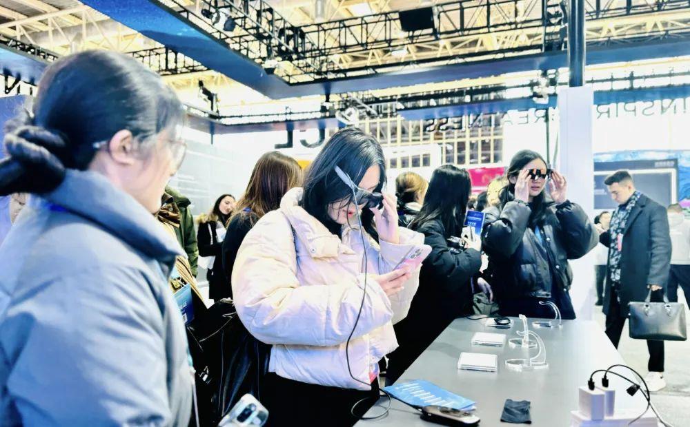 △链博会数字科技链展馆一展位前,观众正在试戴AR眼镜。