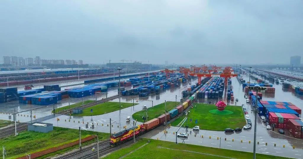 在陕西西安国际港站内,伴随一声汽笛长鸣,满载货物的中欧班列长安号缓缓驶出。