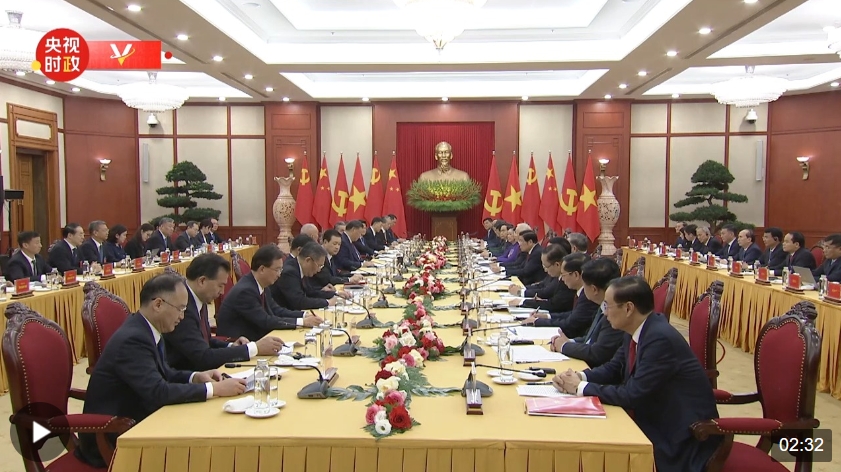习近平指出,很高兴应总书记同志邀请对越南进行国事访问。总书记同志是我的老朋友、好朋友。去年年底你访华期间,我们相约在河内见面。今天我如约而至,完成同你的第三轮互访。时隔6年再到河内,我切身感受到越南党、政府和人民的深厚情谊,衷心感谢越方的热情接待和周到安排。中方始终从战略高度和长远角度看待中越关系,把越南视为周边外交的优先方向。着眼为国家谋发展、为人民谋幸福、为人类谋进步,我愿同总书记同志一道宣布中越两党两国关系新定位,在深化中越全面战略合作伙伴关系基础上,携手构建具有战略意义的中越命运共同体。