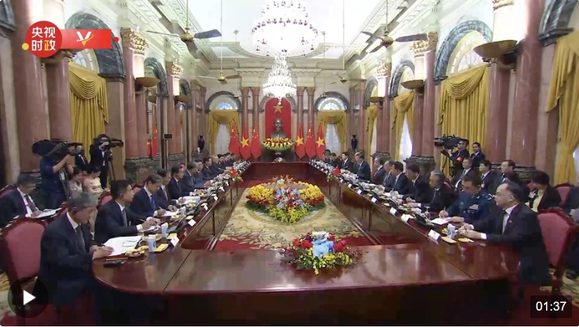 当地时间12月13日上午,中共中央总书记、国家主席习近平在河内主席府同越南国家主席武文赏举行会谈。