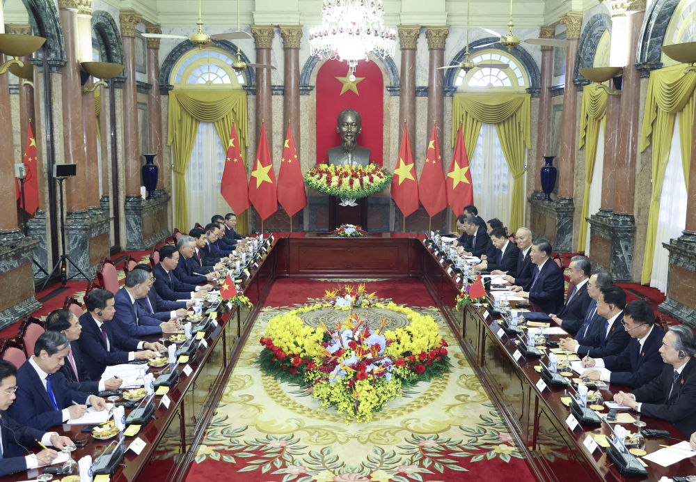 当地时间12月13日上午,中共中央总书记、国家主席习近平在河内主席府同越南国家主席武文赏举行会谈。新华社记者 鞠鹏 摄
