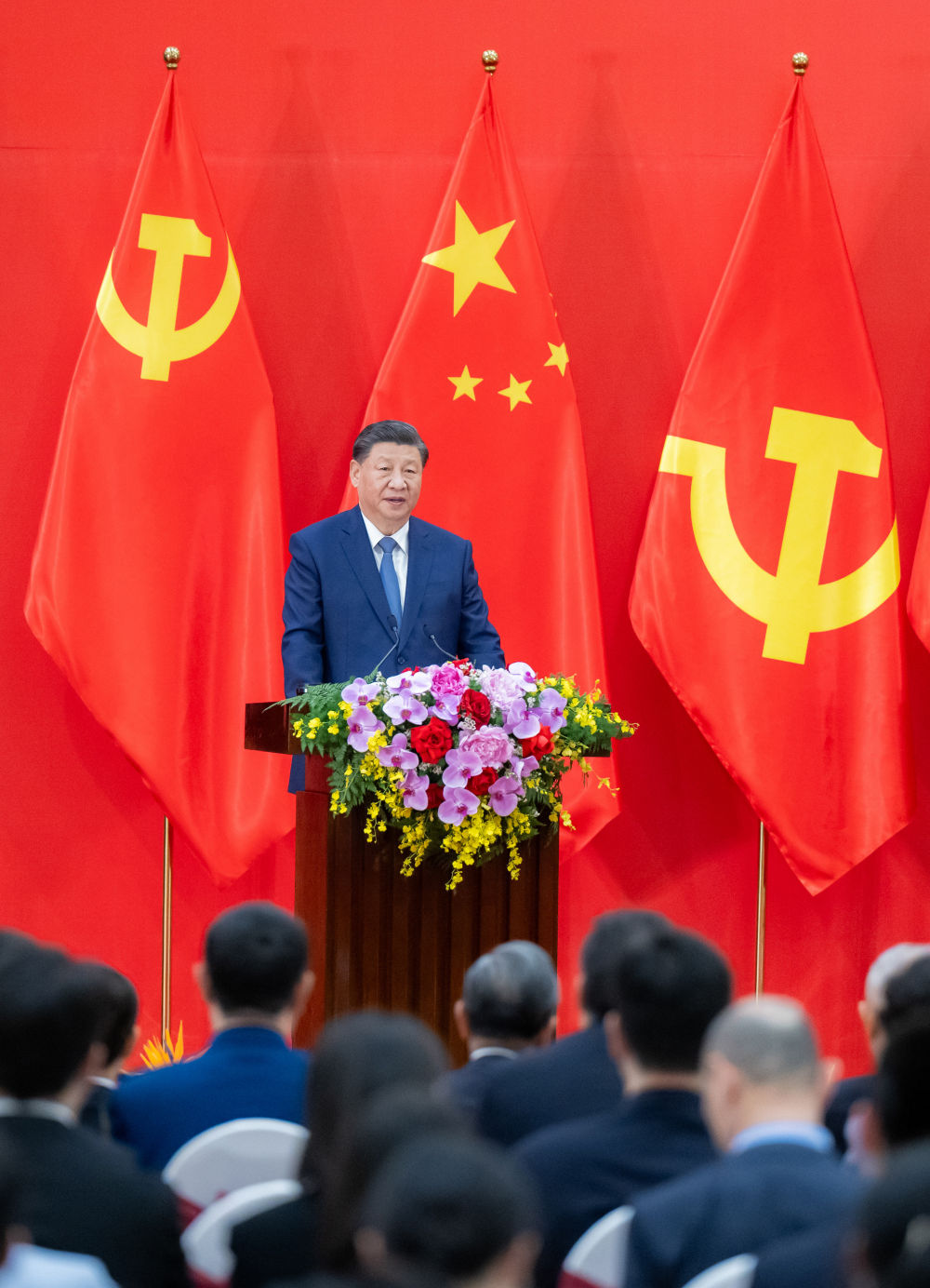 中越友好人士及青年见面会现场气氛热烈,鲜花和两国党旗国旗交相辉映,汇成一片喜悦的海洋。