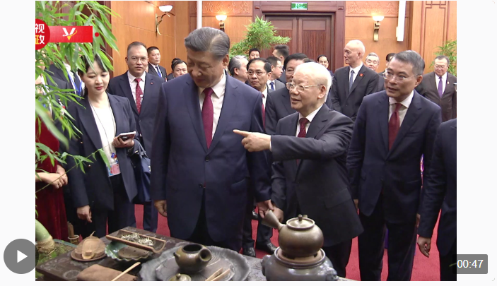 12月12日下午,习近平总书记同阮富仲总书记举行会谈。会谈后,两党总书记共同见证双方签署的双边合作文件展示。阮富仲还邀请习近平进行小范围茶叙。