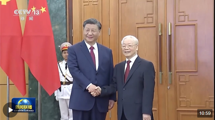 12月12日下午,越共中央驻地。越共中央总书记阮富仲在会谈时说,“相信习近平总书记、国家主席这次访问必将成为推动越中关系更上一层楼的历史里程碑”。