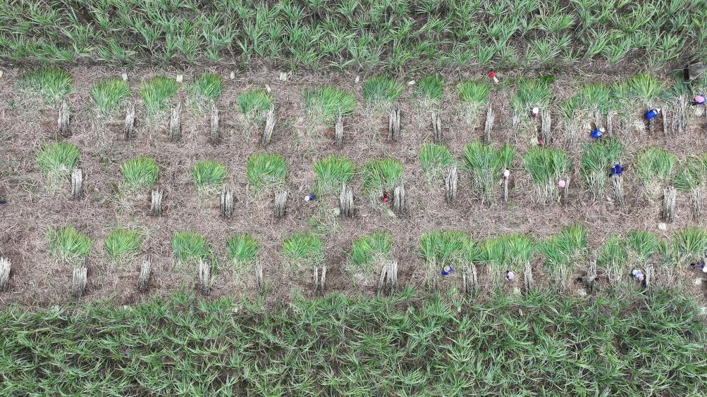 近日,无人机拍摄的广西来宾市兴宾区蔗农正在砍收甘蔗。 新华社记者 周华 摄