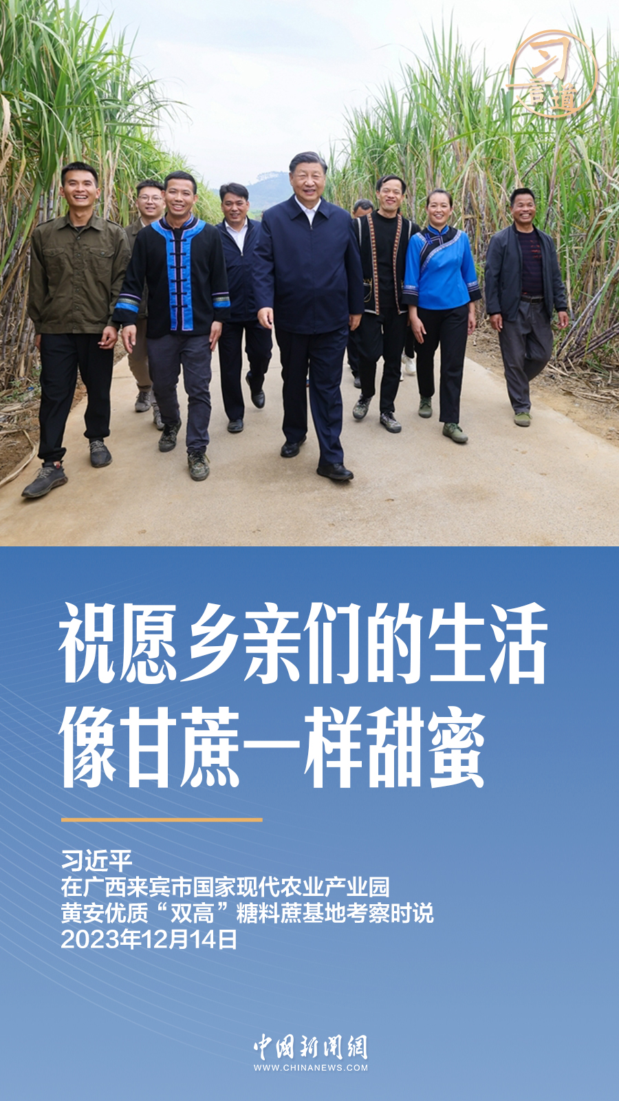 12月14日,在广西来宾的甘蔗林里,习近平向蔗农送上祝福:祝愿乡亲们的生活像甘蔗一样甜蜜。