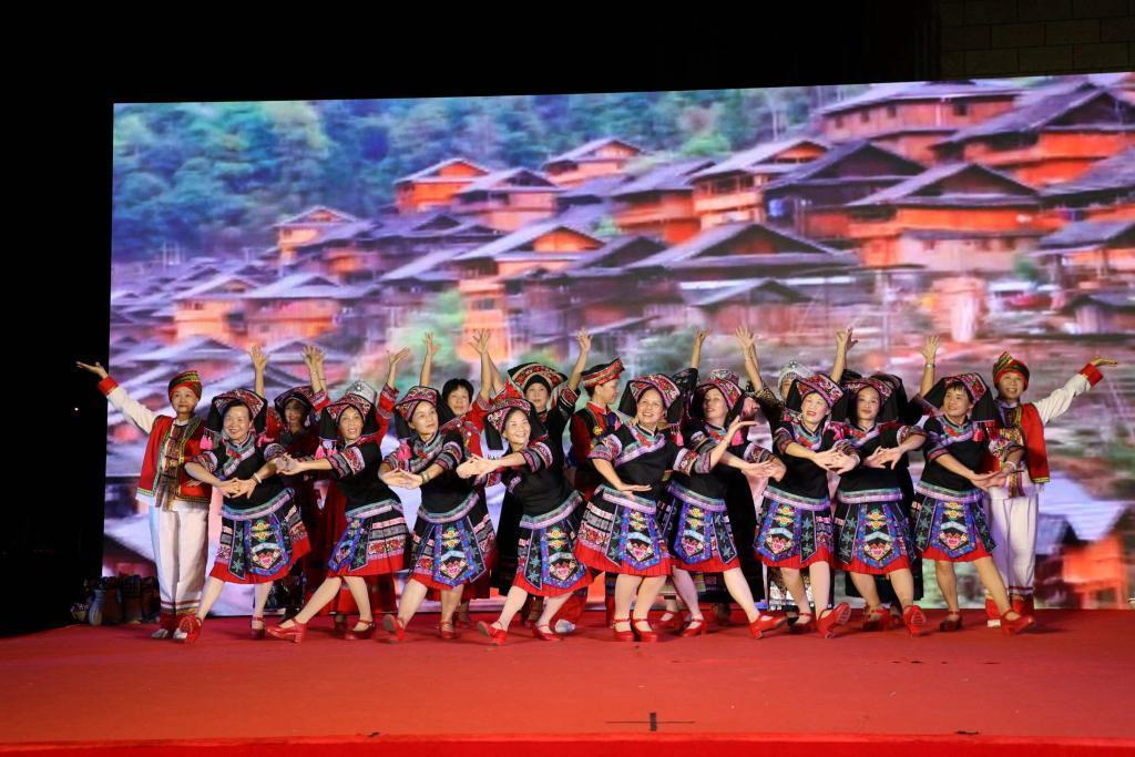 △2023年9月30日,广西南宁市蟠龙社区举办的国庆节晚会,居民们在表演民族舞蹈。