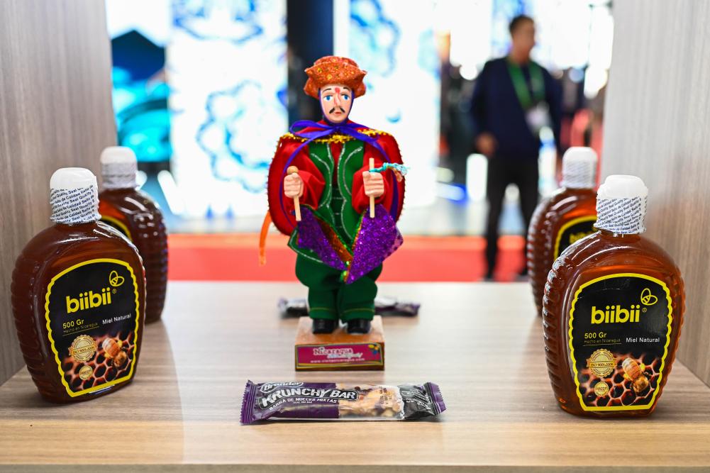 2023年11月8日在第六届进博会上拍摄的尼加拉瓜蜂蜜产品。