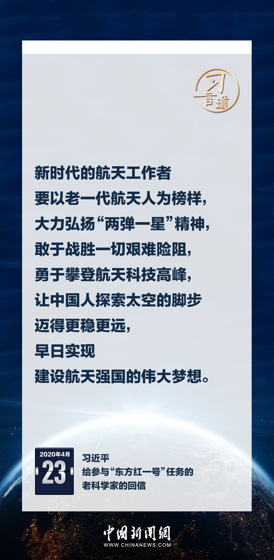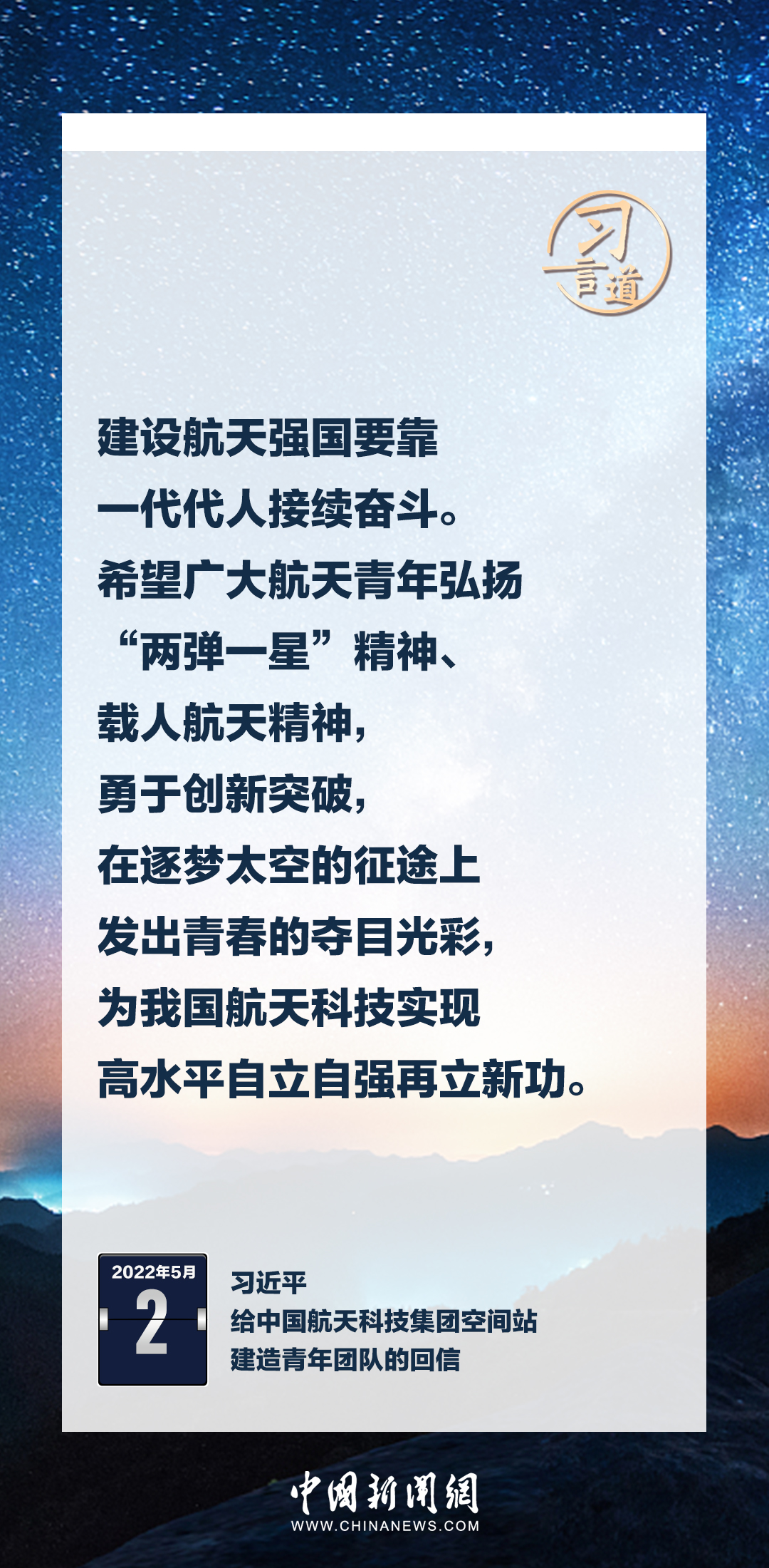 建设航天强国要靠一代代人接续奋斗。在不同场合,习近平总书记频频提及航天精神,激励一代代中国人不断奋进、筑梦太空。