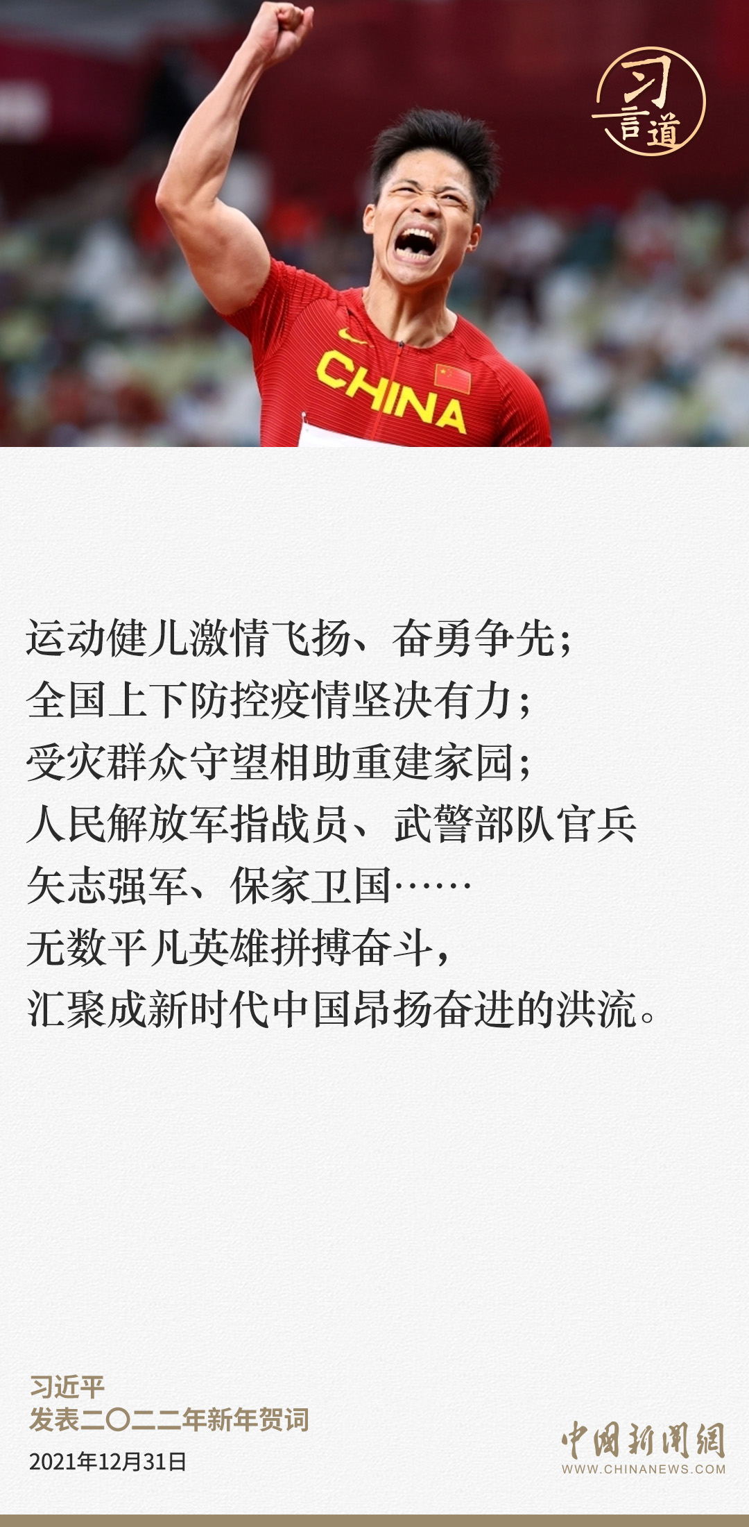 平凡铸就伟大,英雄来自人民。自2013年岁末起,国家主席习近平连续10年发表新年贺词。在新年贺词中,习近平总会为奋斗的中国人点赞、加油鼓劲,勉励大家“征途漫漫,惟有奋斗”。