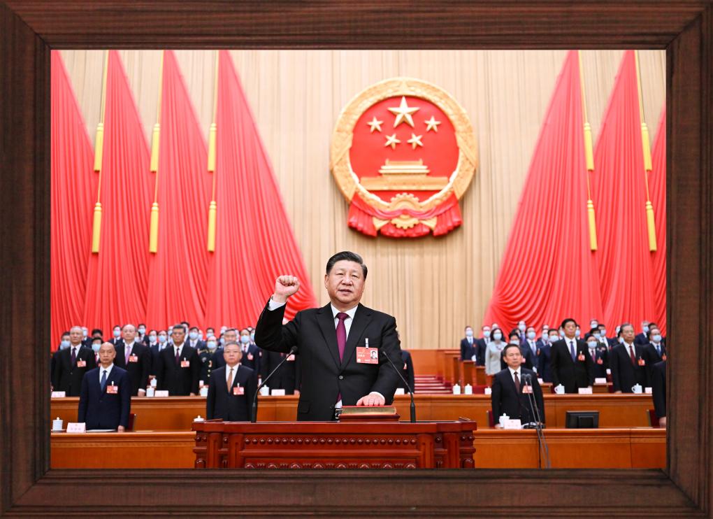 2023年3月10日,北京人民大会堂。全票当选国家主席、中央军委主席的习近平,左手抚按《中华人民共和国宪法》,右手举拳,面向近3000名全国人大代表,郑重宣誓。