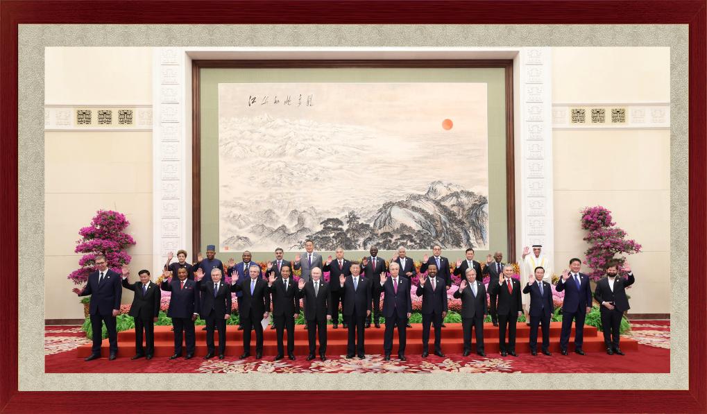人民大会堂,巨幅国画《江山如此多娇》前,习近平主席同出席第三届“一带一路”国际合作高峰论坛的外国国家元首、政府首脑和国际组织负责人等国际贵宾集体合影。