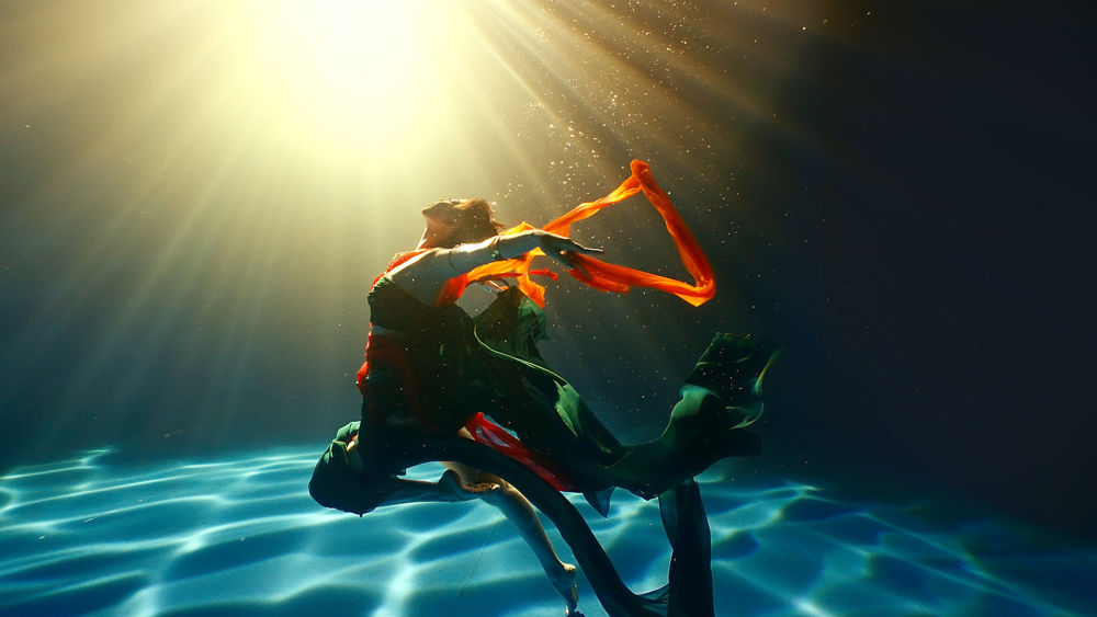演员演绎水下飞天舞蹈《洛神水赋》(视频截图)。