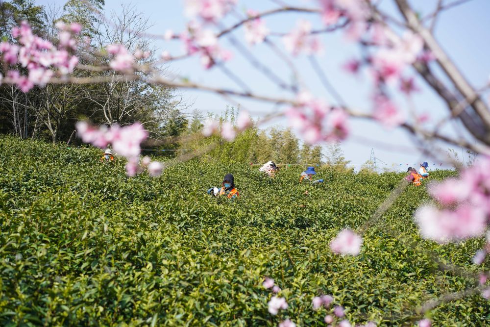 2022年3月29日,采茶人员在黄龙岘茶园采摘鲜叶。