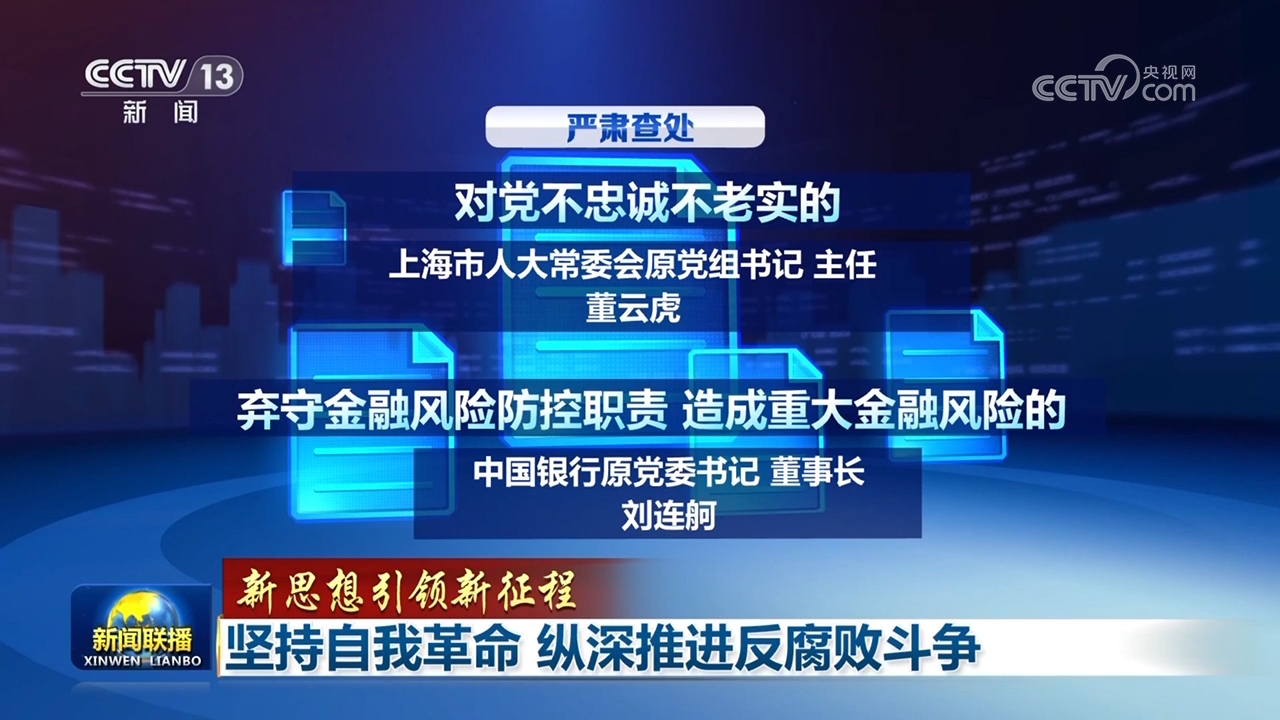 央视网消息(新闻联播):腐败是危害党的生命力和战斗力的最大毒瘤,反腐败是最彻底的自我革命。习近平总书记在党的二十大报告中,对新征程上坚决打赢反腐败斗争攻坚战持久战作出了全面部署。2023年,是全面贯彻党的二十大精神的开局之年,以习近平同志为核心的党中央发扬彻底的自我革命精神,持续发力、纵深推进反腐败斗争,党内政治生态持续净化。