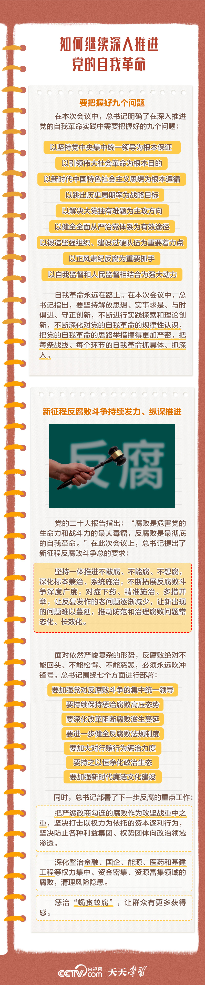 勇于自我革命是我们党最鲜明的品格和最大的优势,总书记多次对推进党的自我革命作出重要部署。此次会议上,总书记深刻阐述了党的自我革命的重要思想,明确提出需要把握好九个问题,并对持续发力、纵深推进反腐败斗争作出战略部署。央视网《天天学习》与您一起学习。