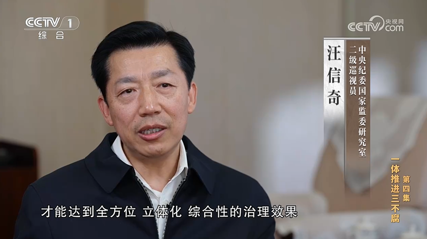 汪信奇(中央纪委国家监委研究室二级巡视员):一体推进“三不腐”蕴含着“惩、治、防”相联系、相结合的辩证统一关系,必须把各项措施有机融合、一体贯通,才能达到全方位、立体化、综合性的治理效果。特别是面对依然严峻复杂的反腐败形势,必须坚持严的基调不动摇,不敢腐、不能腐、不想腐同时发力、同向发力、综合发力,坚决打赢反腐败这场攻坚战、持久战。