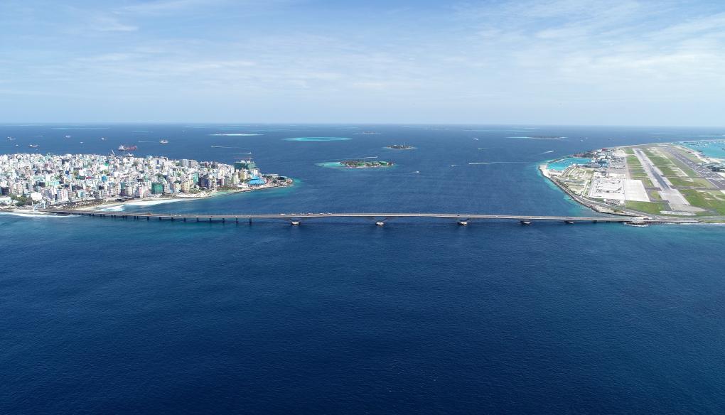 这是航拍的连接马尔代夫首都马累和机场岛的中马友谊大桥。