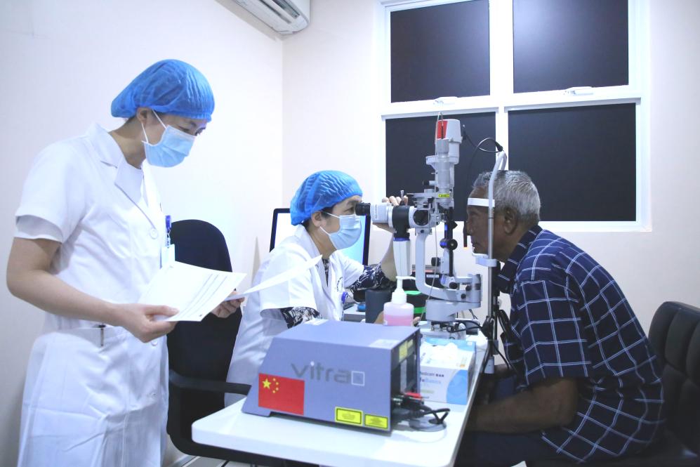 2023年2月4日,在马尔代夫首都马累附近的胡鲁马累医院,中国-马尔代夫眼科中心中方专家为当地患者做眼科检查。