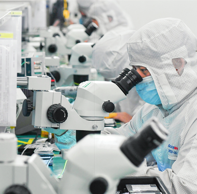在位于武汉中国光谷的光电器件研发制造商——武汉光迅科技股份有限公司生产车间内,技术人员在光模块生产线作业(2023 年 4 月 11 日摄)程敏摄 / 本刊