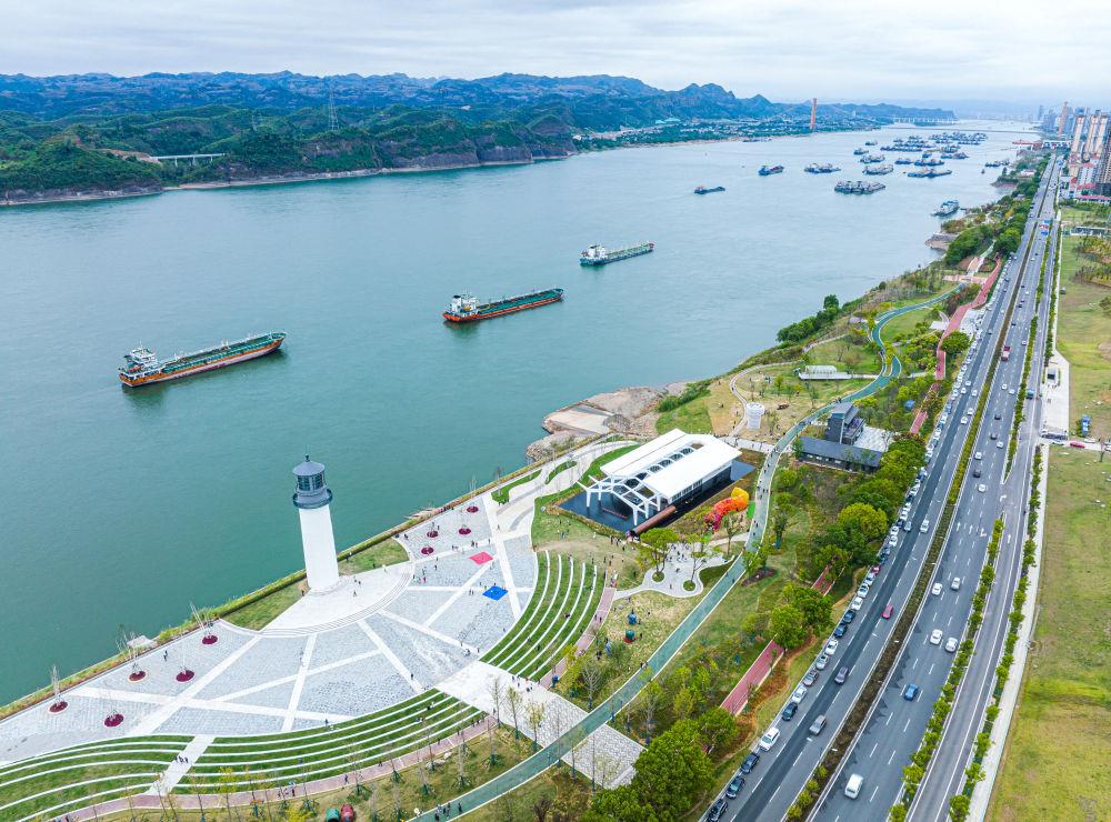 △湖北宜昌市滨江公园灯塔广场。该广场是在实施岸线复绿等综合措施后,由老旧码头改造而成。