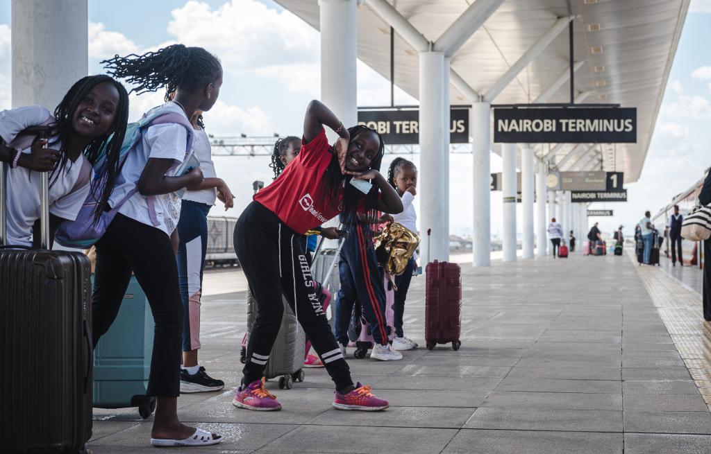 ↑2023年10月6日,儿童在肯尼亚内罗毕的蒙内铁路内罗毕站内等待登车。 共建“一带一路”倡议提出10年来