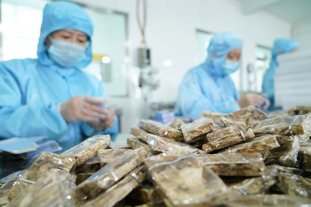 ↑2024年3月12日,在伊春桦肽生物药业有限公司,工作人员在包装桦树汁相关产品。2023年,伊春市桦树汁产业实现产值1.86亿元,同比增长147.44%,生物经济主营业务收入增长20.6%。