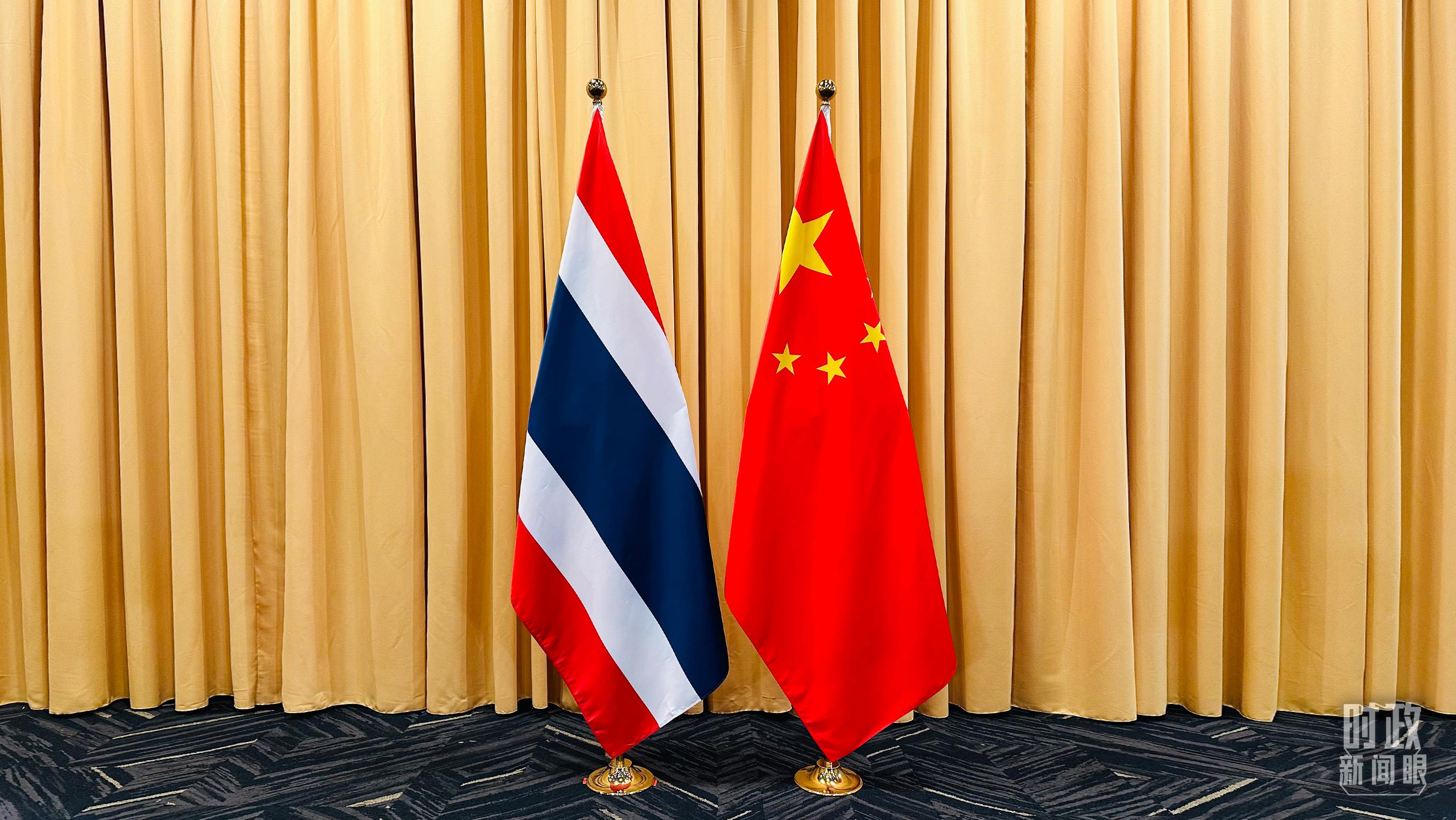 △会见现场的中泰两国国旗。(总台央视记者范一鸣拍摄)