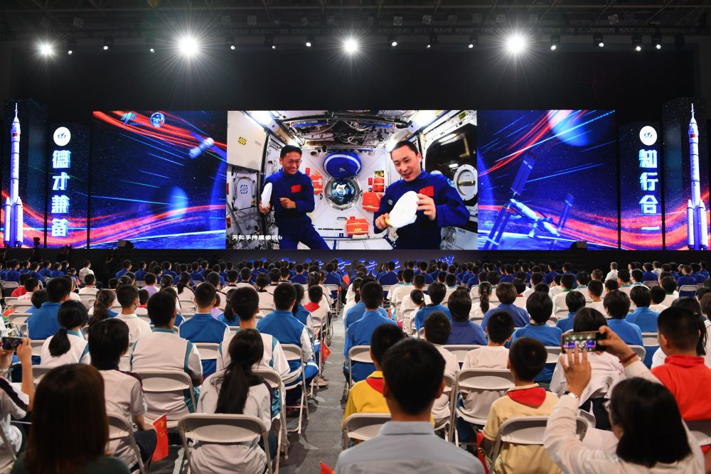 2023年9月21日,在北京航空航天大学,学生收看“天宫课堂”第四课。神舟十六号航天员景海鹏、朱杨柱、桂海潮在轨展示介绍中国空间站梦天实验舱工作生活场景,演示球形火焰实验、奇妙“乒乓球”实验、动量守恒实验以及又见陀螺实验,并与地面课堂进行互动交流。
