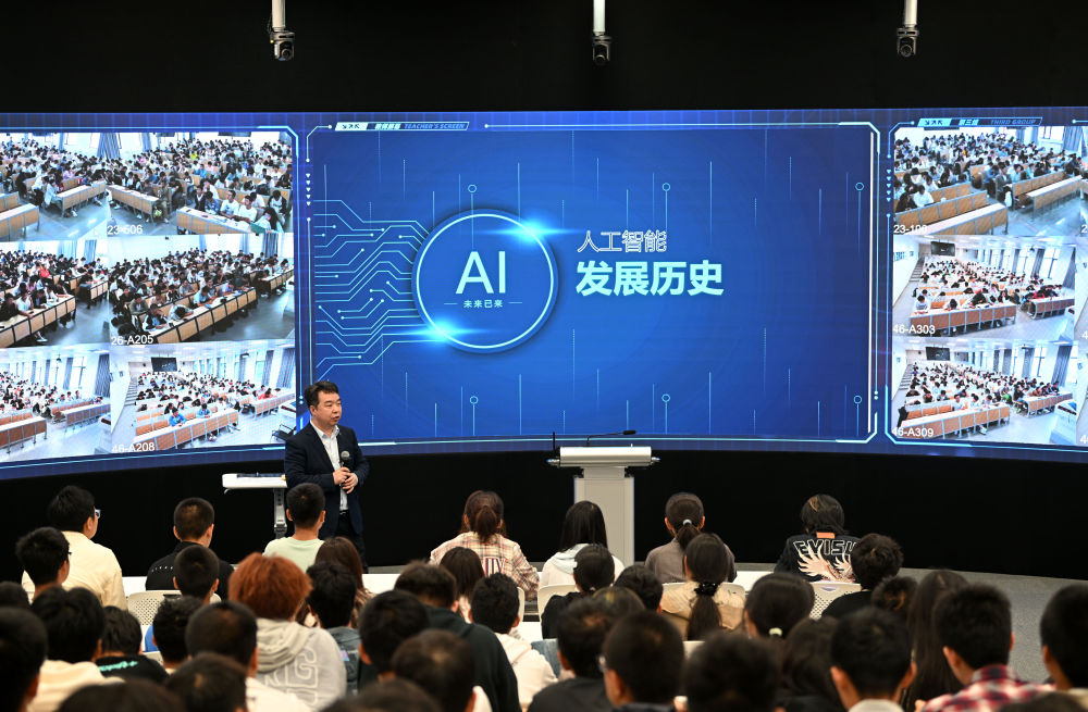 2024年9月20日,天津大学人工智能学院胡清华教授在授课。天津大学在2024年秋季学期推出《人工智能导论》课程,由8位人工智能及交叉学科领域的教授共同打造,同时配备30名来自智算学部、精仪学院、自动化学院、理学院等13个学院的专业教师,面向全体本科生进行授课。