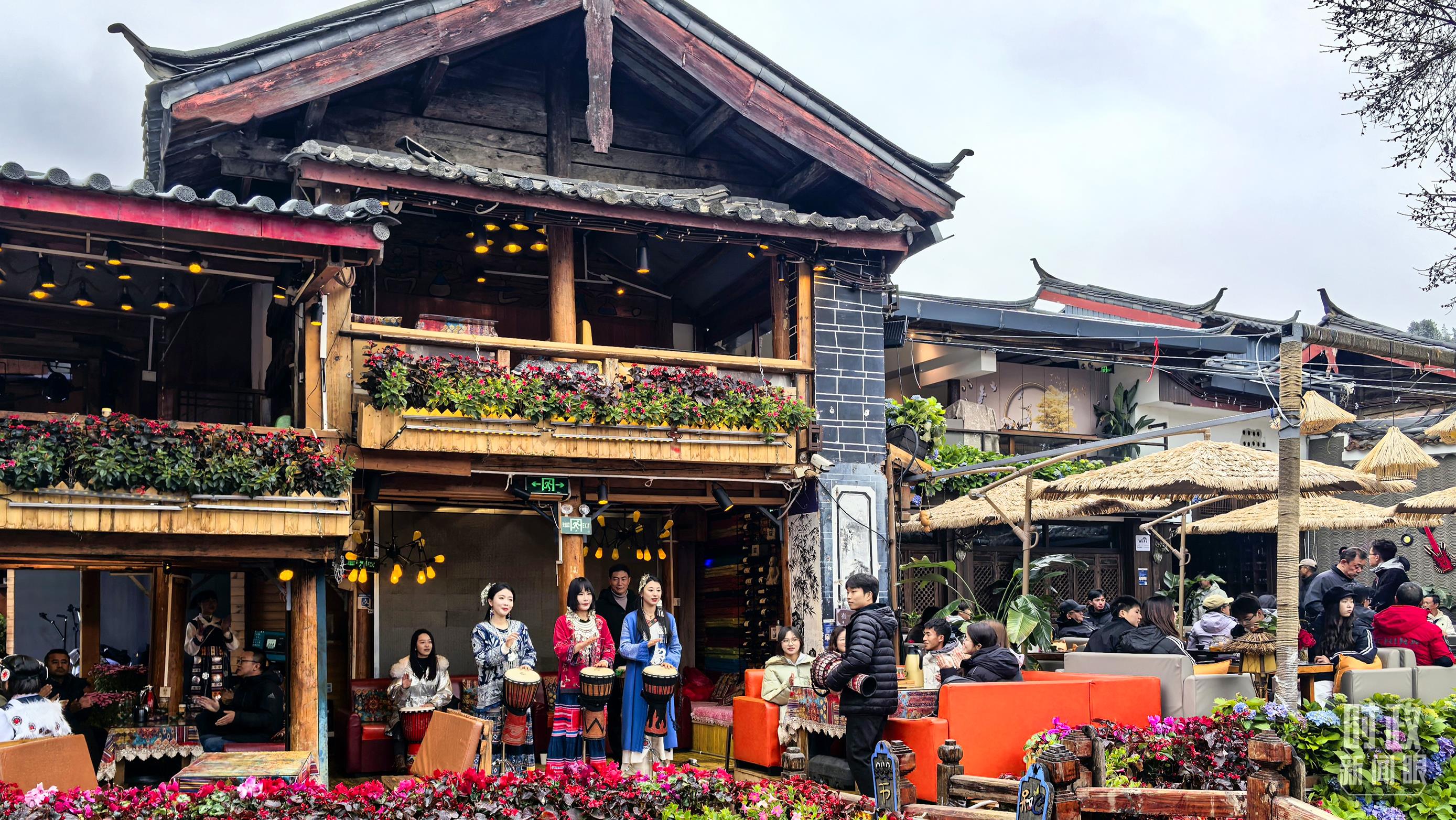 △古城商铺门口的手鼓演奏。(总台央视记者鄂介甫拍摄)