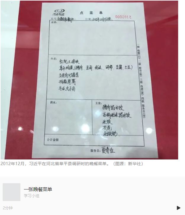 这份菜单,记录了习近平总书记在河北省阜平县调研时的一顿晚餐。