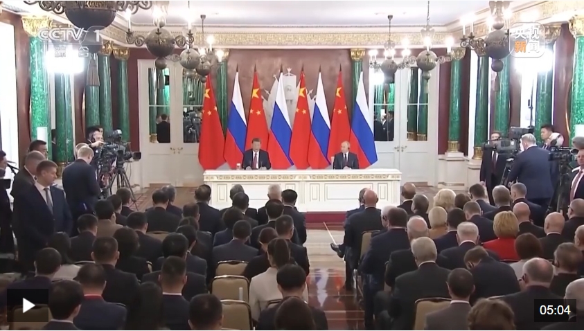 当地时间5月8日中午,国家主席习近平同俄罗斯总统普京在莫斯科克里姆林宫会谈后共同会见记者。