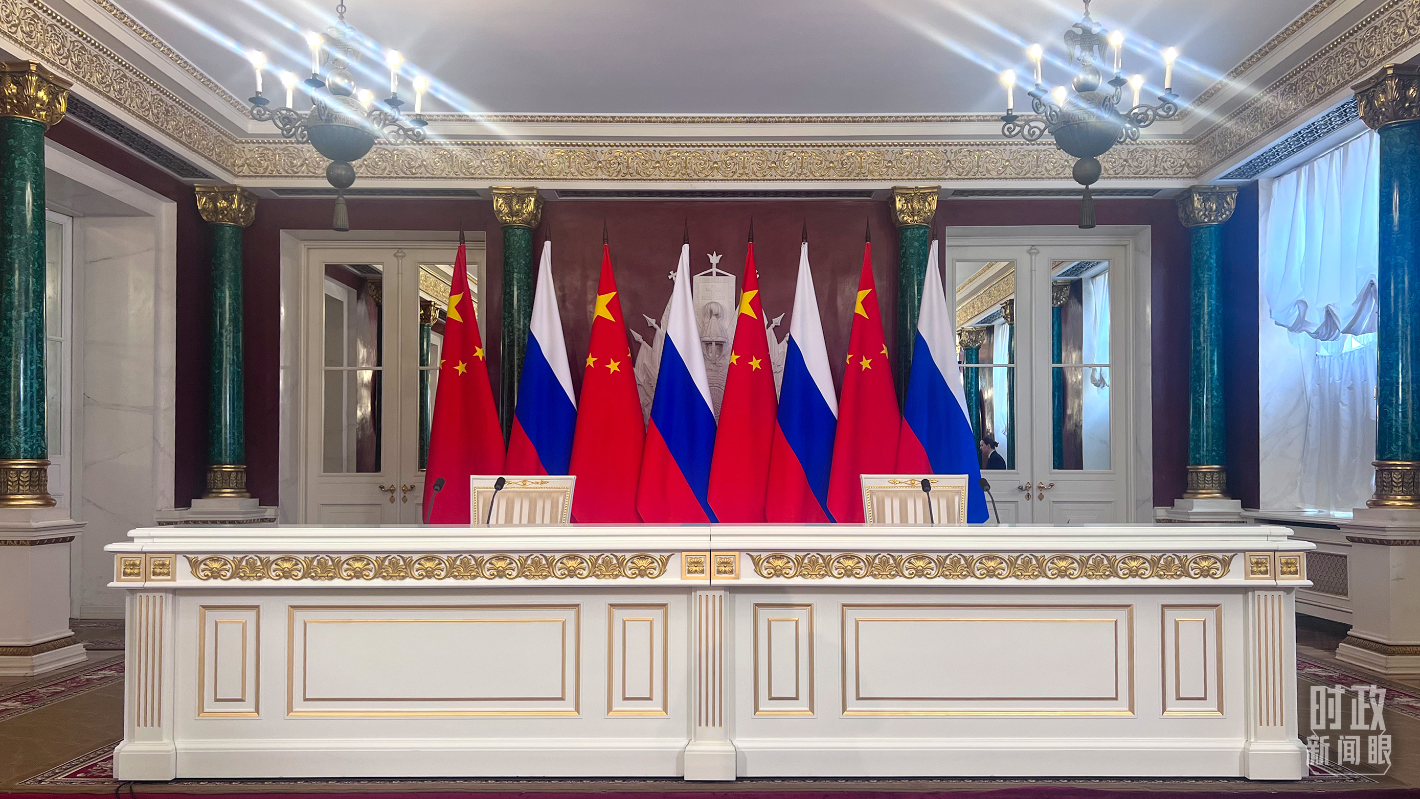 △习主席和普京总统举行大范围会谈的会场。(总台央视记者赵东辰拍摄)