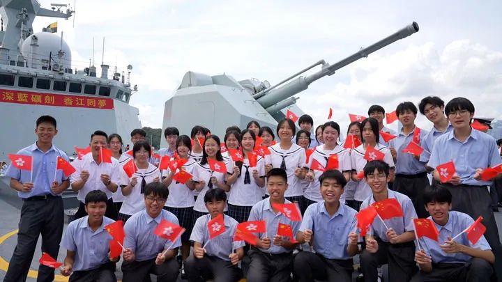 △2025年7月3日,中国海军山东舰航母编队抵达香港。香港中学生登上海军运城舰参观、留影。