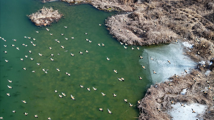 候鸟在黄河宁夏段一处湿地栖息、觅食(2025年2月26日摄,无人机照片)。新华社记者 王鹏 摄