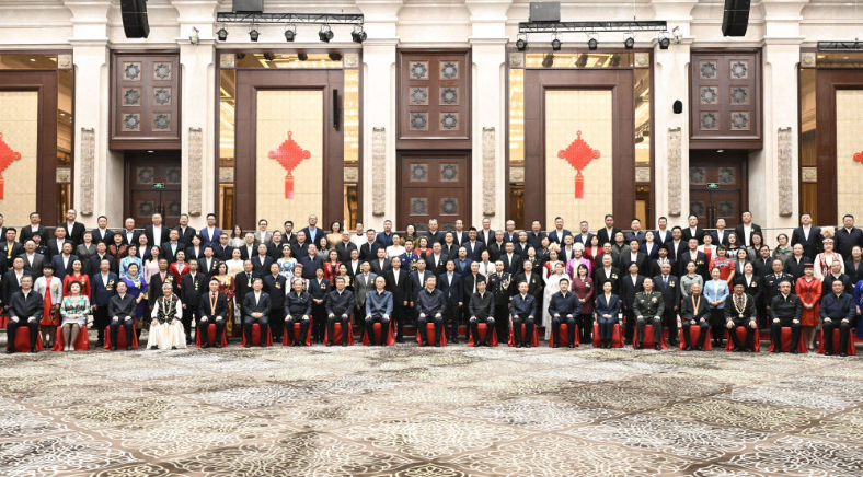 代表中,“七一勋章”获得者魏德友和买买提江·吾买尔、“人民卫士”巴依卡·凯力迪别克、“人民楷模”布茹玛汗·毛勒朵站在第一排。胸前的勋章光灿灿、沉甸甸。