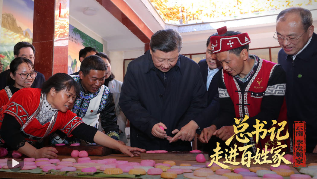 2020年春节前夕,习近平总书记走进云南腾冲市清水乡三家村中寨司莫拉佤族村,同村民李发顺一家制作当地节日传统食品大米粑粑。总书记一连做了两个,笑着说:“摁了个福字,再来一个喜字,有福有喜。”