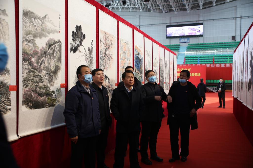 县纪委监委领导班子参观“清廉静乐”第一届廉政文化书画笔会现场。