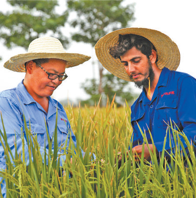 在巴基斯坦东部旁遮普省首府拉合尔西南郊,中国农业专家(左)与育种站助理研究员瓦西姆·瓦希德在稻田里进行杂交水稻选种试验。新华社记者 蒋 超摄