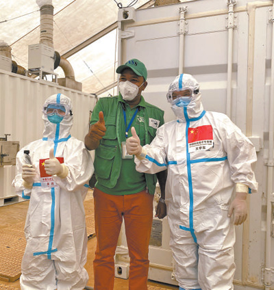 2020年9月2日,在几内亚首都科纳克里的一个核酸检测取样点,中国抗疫医疗专家组成员与当地工作人员合影。新华社发