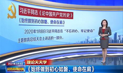 《始终做到初心如磐、使命在肩》是2020年1月8日习近平同志在“不忘初心、牢记使命”主题教育总结大会上讲话的一部分。指出:不忘初心、牢记使命,必须作为加强党的建设的永恒课题和全体党员、干部的终身课题常抓不懈。要以党的创新理论滋养初心、引领使命,从党的非凡历史中找寻初心、激励使命,在严肃党内政治生活中锤炼初心、体悟使命,把初心和使命变成锐意进取、开拓创新的精气神和埋头苦干、真抓实干的原动力。