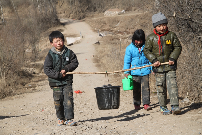 元古堆村的孩子们从取水点抬水。摄于2013年3月。新华社记者 范培珅 摄