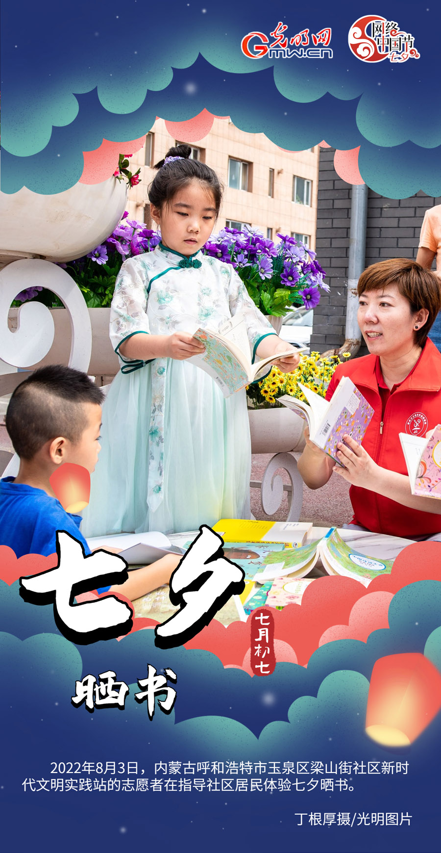 【晒书】古代,“七夕”节有晒书、晒衣的习俗,据说是可以避免虫蛀。汉后各地文化上的交流使节俗融合传播,主要的传统节日都已经普及全国。东汉崔实《四民月令》云:“七月七日,曝经书及衣裳,不蠹。” 2022年8月3日,内蒙古呼和浩特市玉泉区梁山街社区新时代文明实践站的志愿者在指导社区居民体验七夕晒书。(丁根厚摄/光明图片)