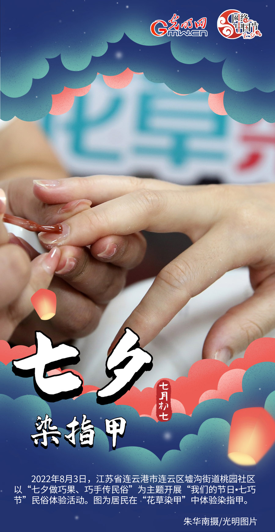【染指甲】是流传在中国西南一带的七夕习俗。许多地区的年轻姑娘,喜欢在节日时用树的液浆兑水洗头发,不仅可以年青美丽,而且对未婚的女子,可以尽快找到如意郎君。2022年8月3日,江苏连云港社区居民在“花草染甲”中体验染指甲。(朱华南摄/光明图片)