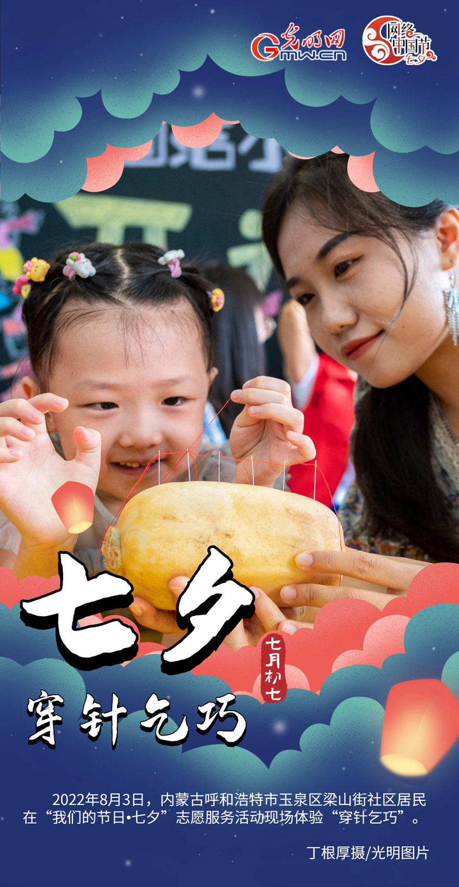 【穿针乞巧】也叫“赛巧”,即女子比赛穿针,她们结彩线,穿七孔针,谁穿得越快,就意味着谁乞到的巧越多,穿得慢的称为“输巧”,“输巧”的人要将事先准备好的礼物送给得巧者。2022年8月3日,内蒙古呼和浩特市玉泉区梁山街社区居民在“我们的节日•七夕”志愿服务活动现场体验“穿针乞巧”。(丁根厚摄/光明图片)