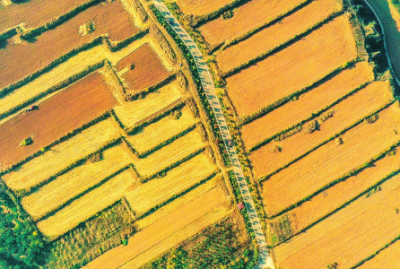 10月30日,无人机拍摄的万荣县城南穗穗香家庭农场山坡梯田。当日,山坡上大型机具正在为刚收获过秋作物的梯田深翻平整土地,已耕棕色土地和未耕的黄色地块构成一幅美丽的田园风景。